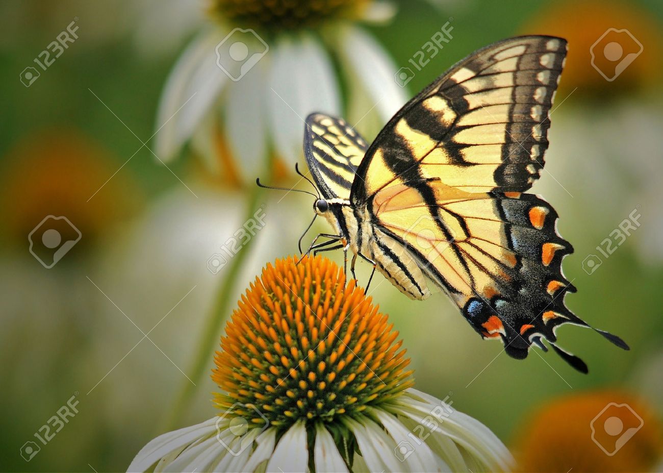 Gmina paziowatych tiger (papilio glaucus linnaeus) na coneflower (jeå¼ã³wka purpurowa)